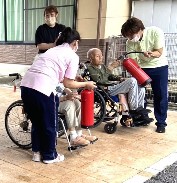 入居者様も水消火器で消火訓練