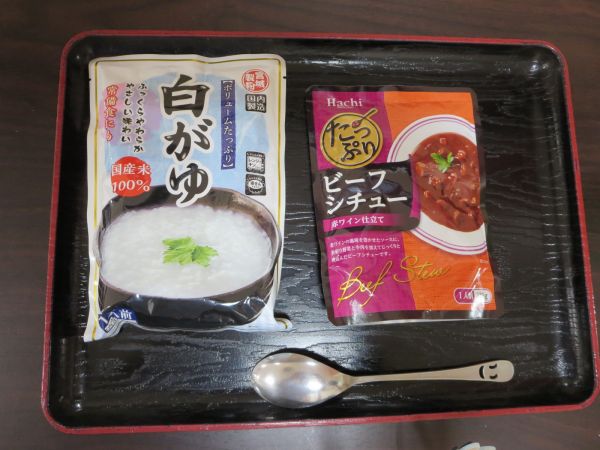 ①昼食には、非常食として備蓄している食料をご入居者・スタッフに食べていただきました。