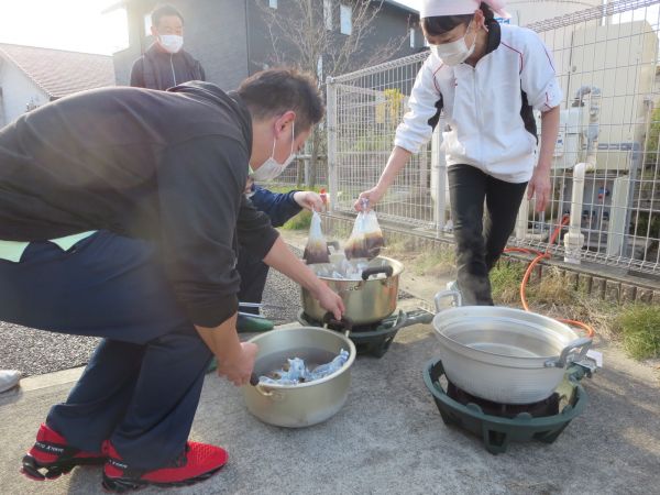 災害用バルクを使用して、直接、戸外のガスタンクに五徳を直結させての炊き出しを、厨房スタッフ、及びグループスタッフと共に行いました。