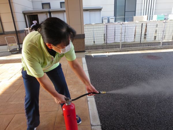 ②水消火器を使用しての消化訓練と消防署への連絡方法の確認。