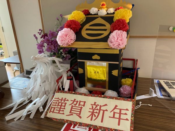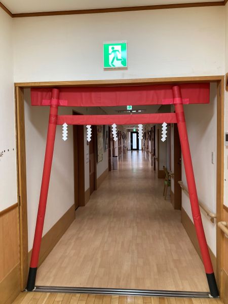 ご入居者様に新年の挨拶を終え、これから朝食を召し上がっていただいた後に、赤く大きな鳥居をくぐっていただいた先には、みどり神社へ参拝していただきます。