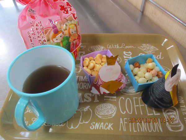本日は、皆でおやつのレクリエーション♡   ひな祭りが過ぎ少しずつ春が近づいて来ています。