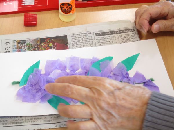 今月は、春らしい壁紙作りや塗り絵等の工作やハンドベルの演奏を