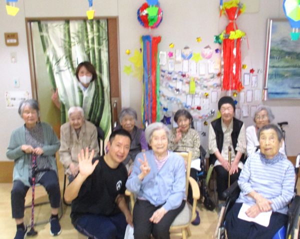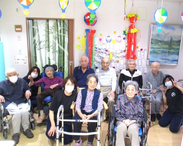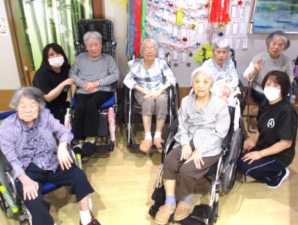 玄関の七夕飾り前で記念撮影をした後、七夕ゼリーを
